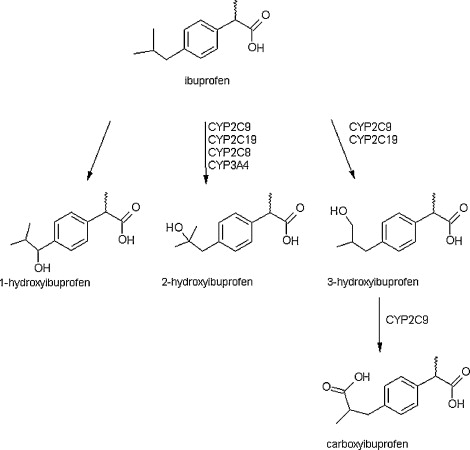 이부프로펜의 대사는 2 또는 3-하이드록시 유도체의 형성을 위한 Isobutyl chains의 하이드록실화에 이어, 2-carboxy-ibuprofen and p-carboxy-2-propionate의 산화가 1단계이다. 이러한 산화 반응은 cytochrome P450 동형 CYP 2C9, CYP 2C19 및 CYP 2C8의 활성에 의해 일어난다. 따라서 이러한 효소는 alkyl side chain를 하이드록실 및 카르복실 유도체로 산화시키는 데 참여한다. 이 효소에서 산화 대사를 형성하는 주요 촉매는 동형 CYP 2C9이다. 2단계에서는 phenolic and acyl glucuronides를 형성한다.