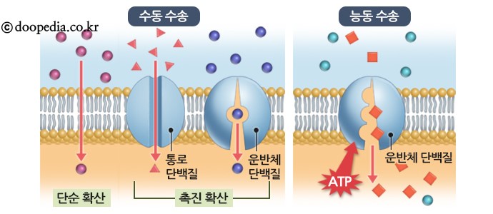 물질이 막을 통과하는 법에는 크게 수동수송(passive transfer)과 능동 수송(active transfer)이 있다. 수송 수송은 딱히 생체 에너지가 필요하지 않으며, 고농도에서 저농도로 이동한다. 능동 수송은 수동 수송과는 다르게 ATP(adenosine triphosphate) 가수분해 에너지가 필요하다. 이 에너지를 통해 저농도에서 고농도로 물질을 세포막 밖, 또는 안쪽으로 역행시킬 수 있다.