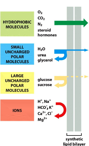 세포막의 인지질 2중층의 영향 때문에 단순확산은 지질용해도(lipid solubility)에 큰 영향을 받는다. 지질용해도∝확산속도 라고 말해도 무방하다.(지질용해도가 높은 물질은 인지질 막을 통해 쉽게 확산된다는 소리다.) 그 외에도 O₂, CO₂ 등의 기체, 벤젠과 같은 소수성 분자1와 작은 극성분자는 인지질 막을 통과할 수 있다. 하지만 포도당과 같은 큰 극성분자와 아미노산, 이온같은 전하를 띠는 분자는 통과하지 못한다. (포도당과 아미노산은 후에 기술할 촉진 확산을 통해서 세포막을 통과한다.) 작은 무극성 분자들처럼 어떤 것의 도움도 없이 날것의 상태로 막을 통과하면서 단순 확산(simple diffusion)을 하는 것이다. 그러나 극성을 지닌 이온들은 막단백질의 도움을 필요로 하며, 이러한 확산을 촉진 확산(facilitated diffusion, carrier-mediated diffusion)이라고 한다.