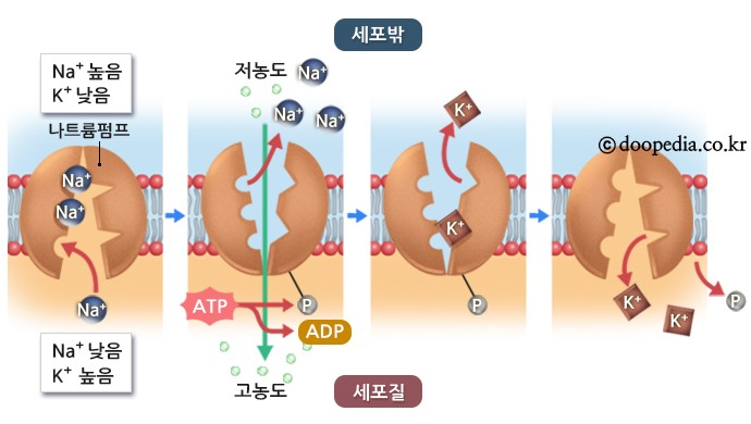이 능동수송의 예로 가장 많이 대두되는 것이 Na-K (Sodium-potassium) 이다. 체내에서 칼륨 이온 농도는 안쪽이, 나트륨 이온 농도는 항상 바깥쪽이 높게 유지된다. 앞서 단순확산에서 언급하였듯이 확산은 생체막 양쪽 부분의 농도 차이가 사라지게 되어 물질의 농도가 평형상태(equilibrium state)에 도달하게끔 만든다. 하지만 이 나트륨 이온과 칼륨이온은 그렇지가 않다. 이 이유가 바로 능동 수송에 있는 것이다. 2