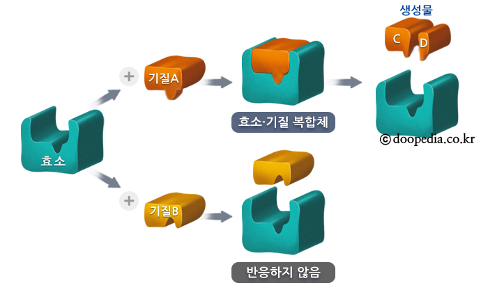 각종 화학반응에서 자신은 변화하지 않으나 반응속도를 빠르게 하는 단백질을 말한다. 즉, 단백질로 만들어진 촉매라고 할 수 있다. 일반적으로 화학반응에서 반응물질 외에 미량의 촉매는 반응속도를 증가시키는 역할을 한다. 생물체 내에서 일어나는 화학반응도 촉매에 의해 속도가 빨라진다. 특별히 생물체 내에서 이러한 촉매의 역할을 하는 것을 효소라고 부르며 단백질로 이루어져 있다. [ 효소의 작용] 단백질로 이루어져 있기 때문에 무기촉매와는 달리 온도나 pH(수소